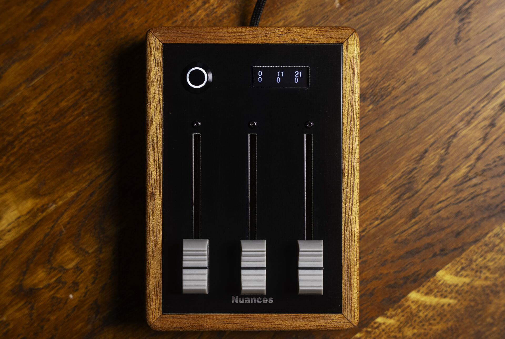 Nuances Controller is a professional grade midi CC controller in an oiled wood case. It is carefully build to last for most demanding composers working with orchestral libraries.
